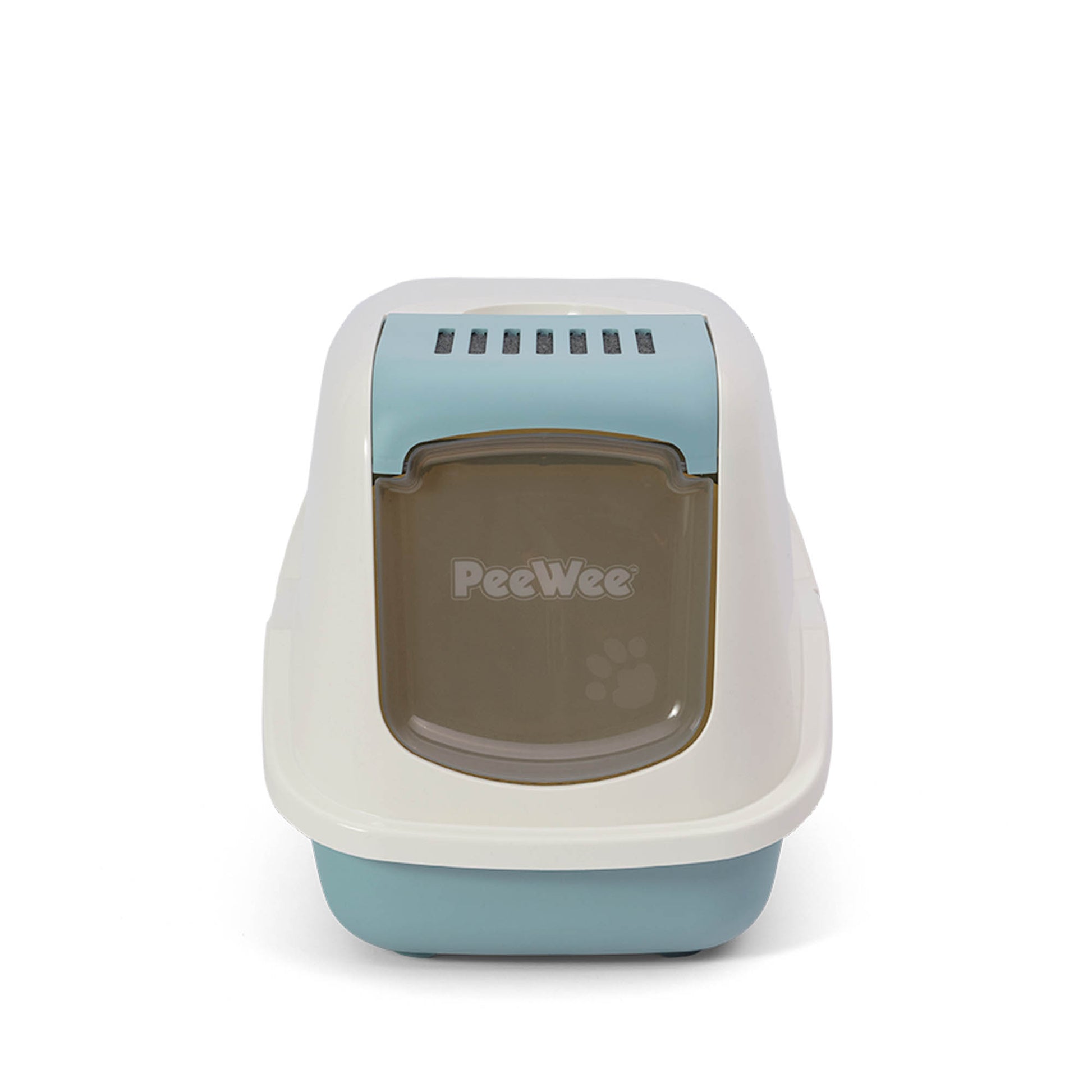 PeeWee EcoHus Katzenklo Taubenblau – Starterpaket mit Haube & 3 kg Holzpellets